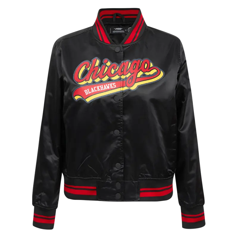 Home / Shop / Chicago Blackhawks / NHL CHICAGO BLACKHAWKS SCRIPT TAIL WOMEN’S SATIN JACKET (BLACK\/RED\/BLACK)