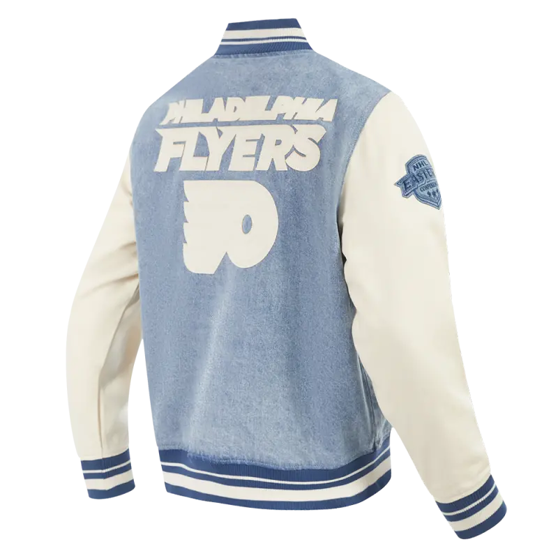 Home / Shop / JACKETS / NHL PHILADELPHIA FLYERS VARSITY BLUES MEN’S DENIM VARSITY JACKET (DENIM\/LINEN)